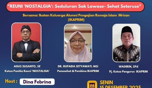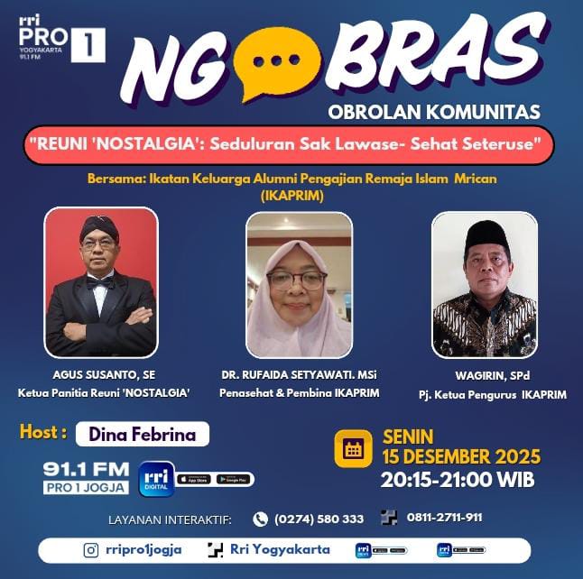 KORAN MERAPI – Ikatan Keluarga Alumni Pengajian Remaja Islam Mrican (IKAPRIM) akan menggelar acara spesial bertajuk Reuni ‘Nostalgia’: Seduluran Sak Lawase – Sehat Seteruse. Acara ini dikemas dalam bentuk Obrolan Komunitas (NGOBRAS) yang akan disiarkan langsung melalui RRI Pro 1 Jogja 91.1 FM pada Senin, 15 Desember 2025 mendatang, pukul 20.15 – 21.00 WIB.