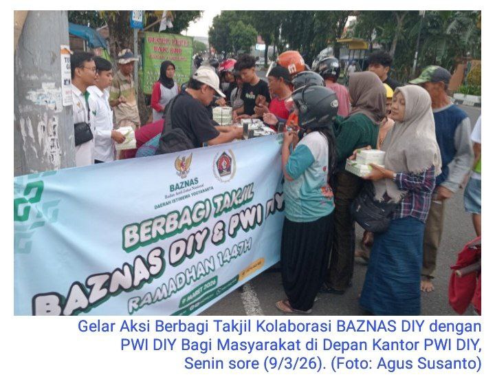 KORAN MERAPI – Pada bulan suci Ramadhan 1447 H ini, Badan Amil Zakat Nasional (BAZNAS) DIY berkolaborasi dengan Persatuan Wartawan Indonesia (PWI) DIY menggelar aksi sosial “Berbagi Takjil” bagi para pengguna jalan. Kegiatan yang berlangsung Senin sore (9/3/26) di depan Kantor PWI DIY, Jl. Gambiran 45 Pandeyan Umbulharjo Yogyakarta ini sekaligus menjadi bagian dari rangkaian peringatan Hari Pers Nasional (HPN) 2026.