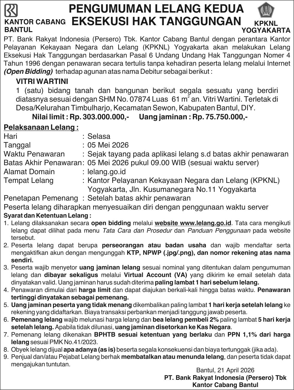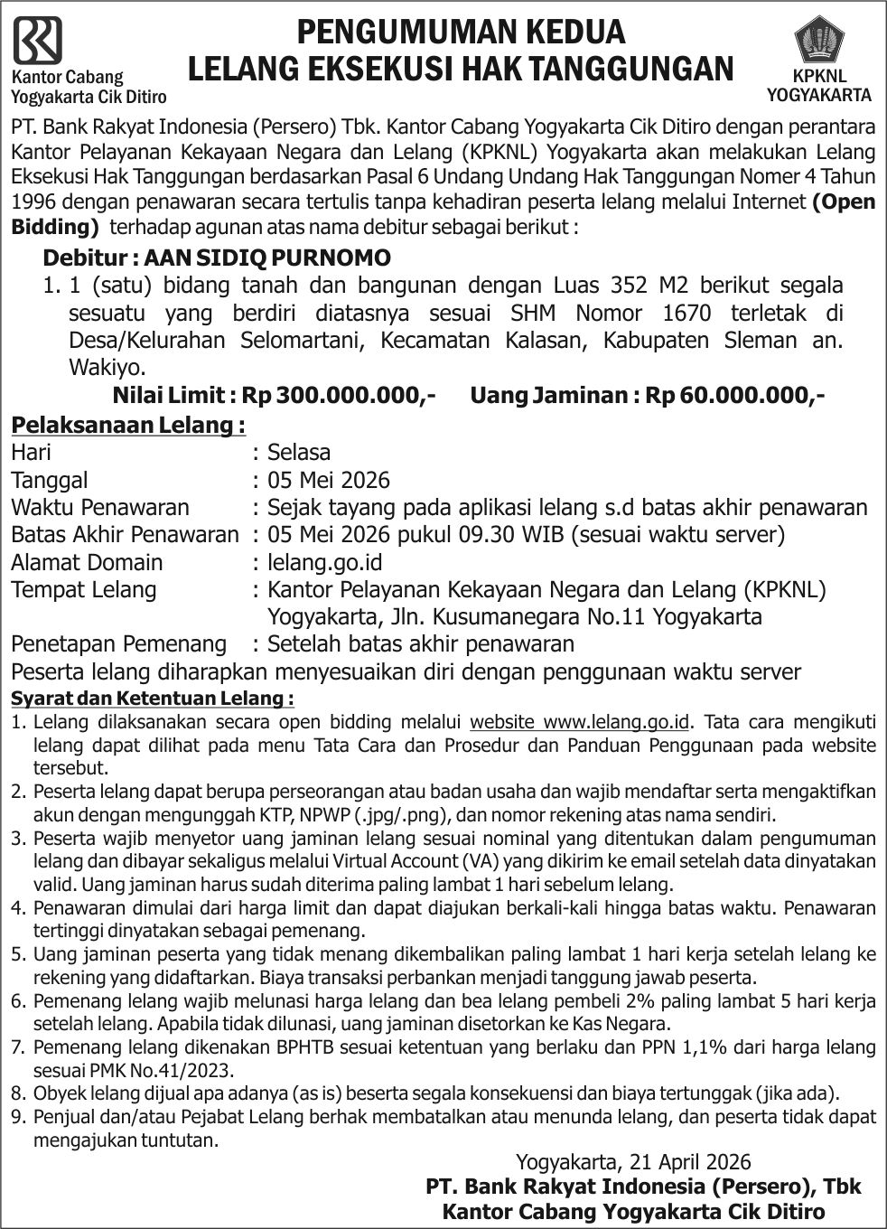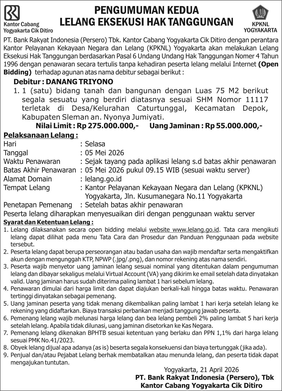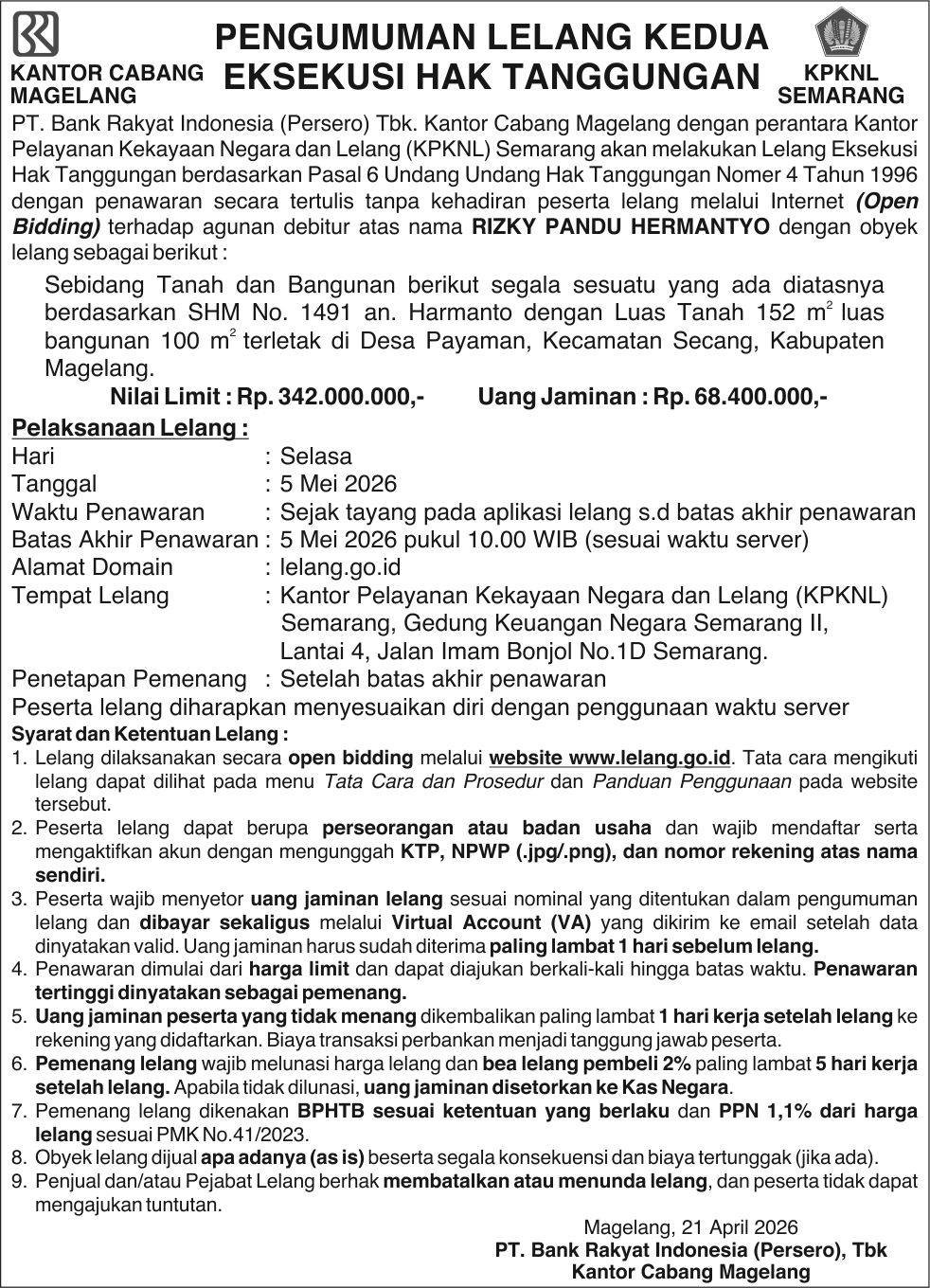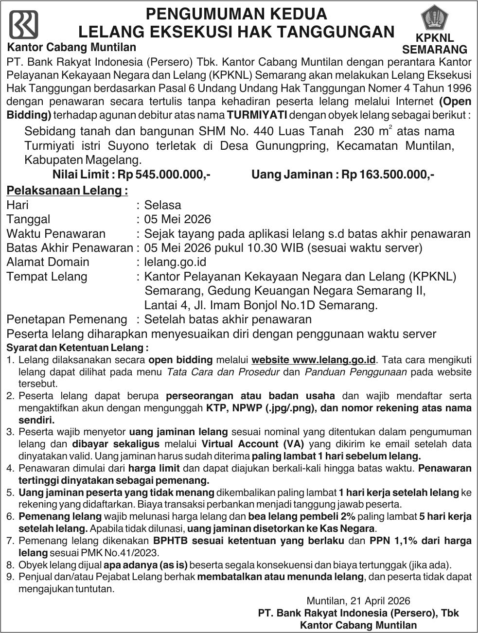 KORAN MERAPI – Pengumuman Kedua Lelang PT Bank Rakyat Indonesia (BRI) Tbk, Eksekusi Hak Tanggungan; Kamis, 23 April 2026